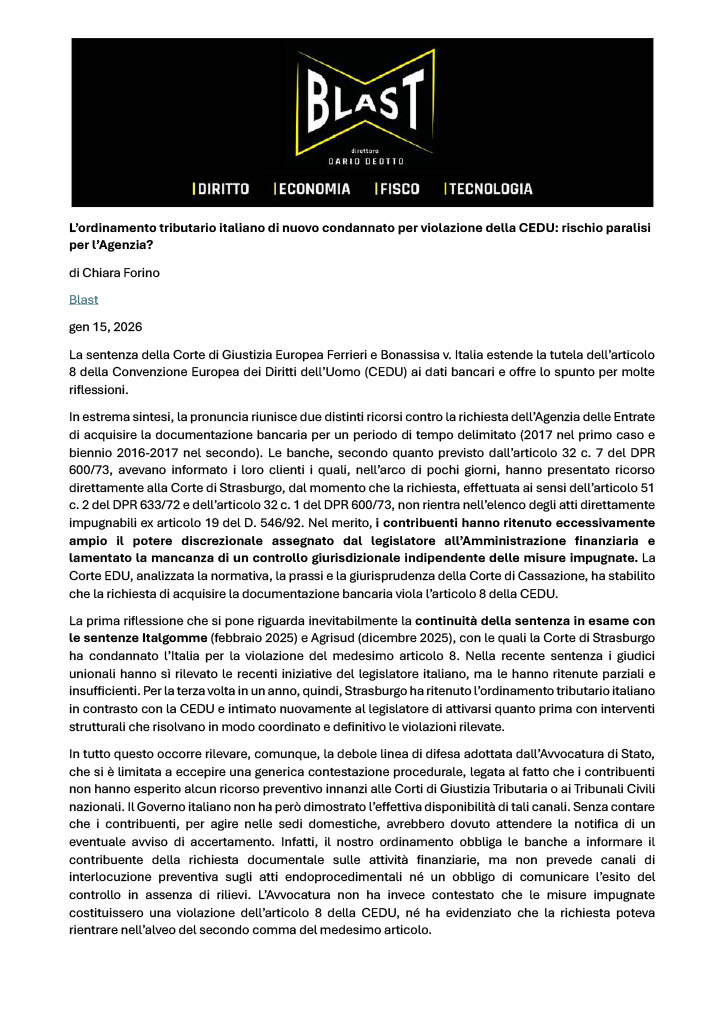Nell’articolo pubblicato su Blast – Diritto Economia Fisco e Tecnologia , oltre ad evidenziare l’urgenza di un intervento normativo domestico che conformi l’ordinamento alle indicazioni della Corte di Strasburgo, Chiara Forino analizza gli aspetti meno commentati della sentenza, dalla Dissenting Opinion ai potenziali effetti sulle attività di controllo e di lotta all’evasione fiscale.