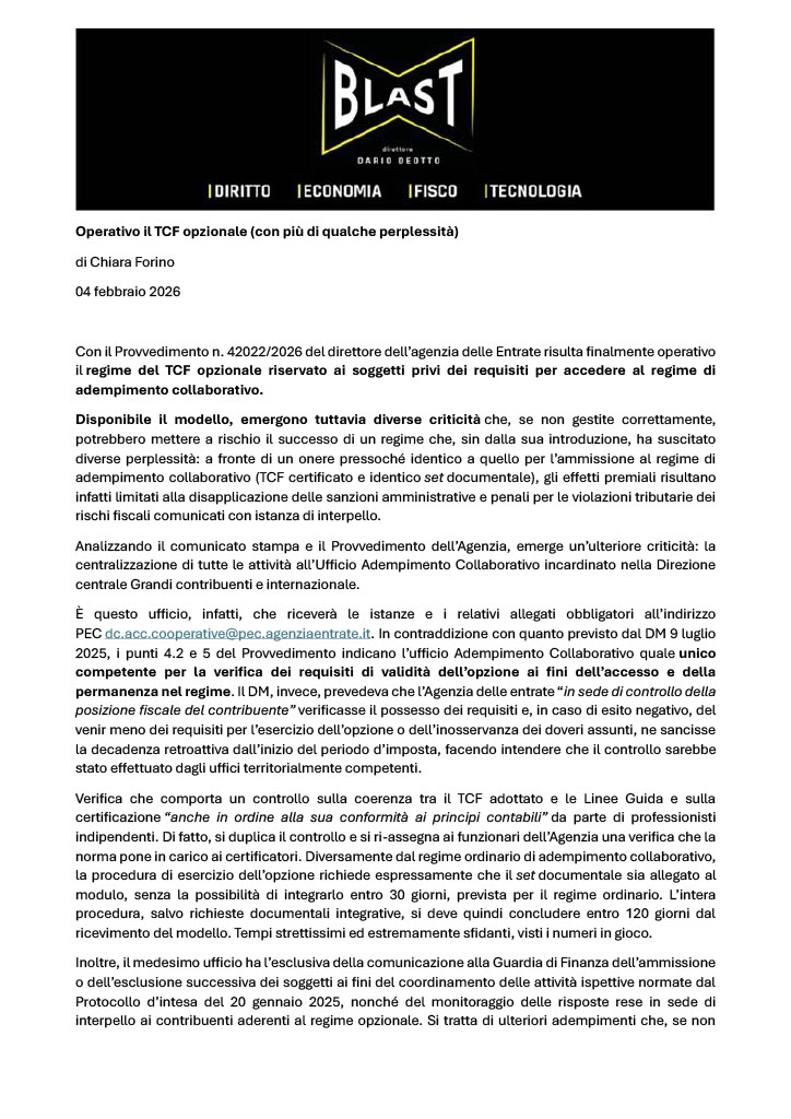 Su Blast – Diritto Economia Fisco e TecnologiaChiara Forino commenta gli aspetti tecnici della procedura di comunicazione, con i vantaggi previsti per le società che eserciteranno l’opzione, ma anche le criticità organizzative che emergono dalla decisione di assegnare al già oberato ufficio Adempimento Collaborativo la competenza esclusiva di tutte le attività di ammissione e permanenza nel regime opzionale.